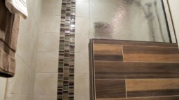 Contemporary walk in shower with 12×24 Kensington Beige tile on the shower walls. Daltile Acacia Valley 6×36 in Ridge wrap a pony wall that seamlessly supports a rain glass partition that combines sensational privacy and style. Drama was added with a gorgeous glass and metal mosaic mix running top to bottom in a single band. Corrugated Series by Glazzio Tiles in Ginger Clove was used as this band and in the built in niche.