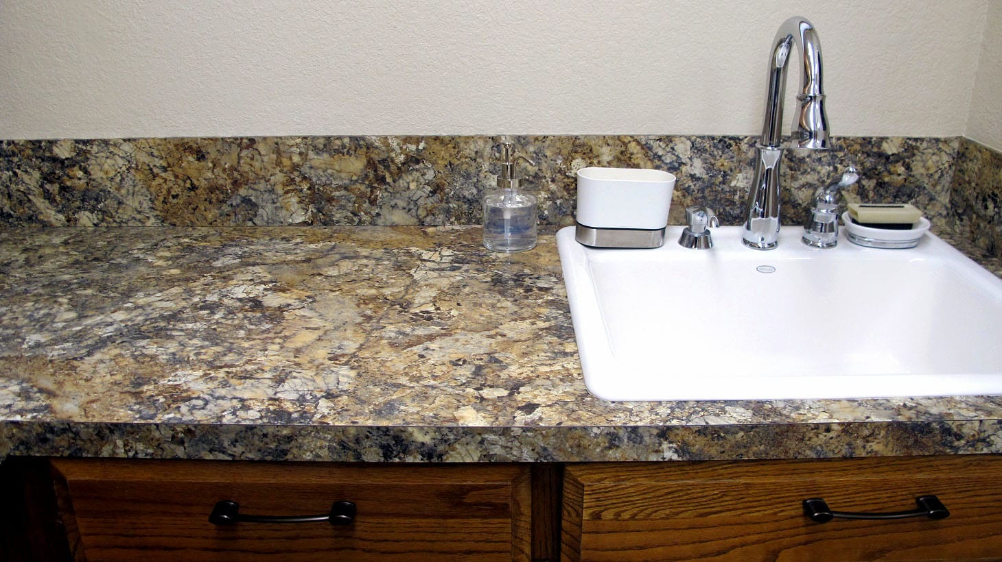 In the laundry room, WIlsonart High Definition laminate in Summer Carnival expands the length of the countertop from all angles, with a seamless flat edge and 6″ backsplash.