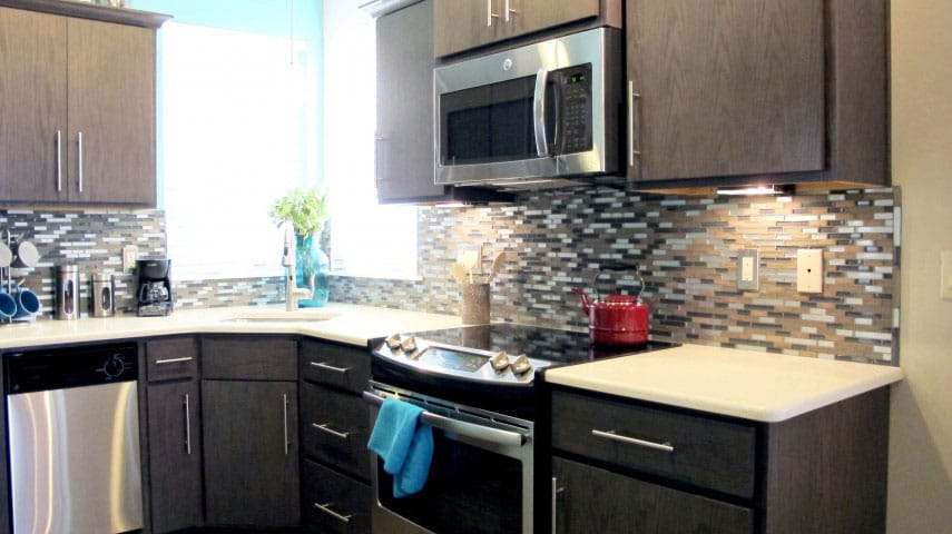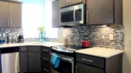 The kitchen boasts a full linear backsplash by Cronin. The Cronin Blend backsplash in color, Frozen Falls reaches the upper cabinets and wraps the window above the kitchen sink making this kitchen not only, beautiful but visually larger than it really is. The backsplash reflects light and the quartz countertop creates a beautiful contrast.