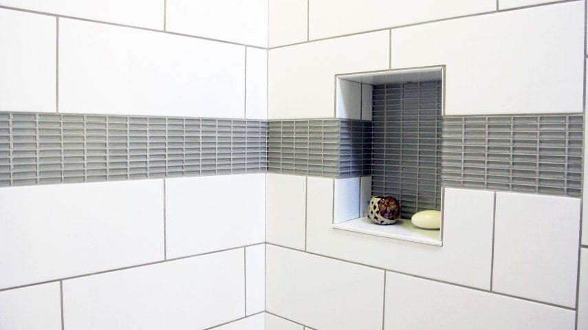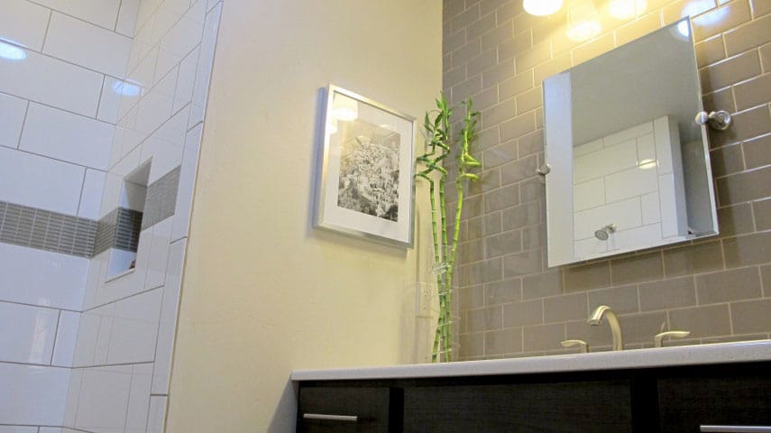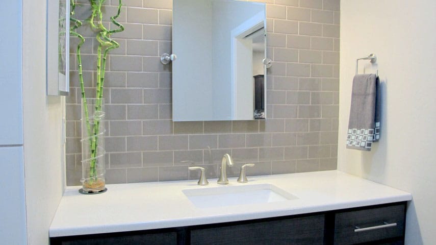 Down a hallway you will find the master bedroom and bathroom which features a custom walk-in shower decorated in Thompson Tile’s Colour & Dimensions 8×20 field tile and Cristallo Glass in a 1/2×2 stacked pattern, color – Special Gray. Above the vanity features a 3×6 Colour & Dimensions subway tile in glossy Dark Taupe and creates a focal point that is simple yet dramatic. Similar quartz countertops and dark cabinets complete the look.