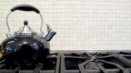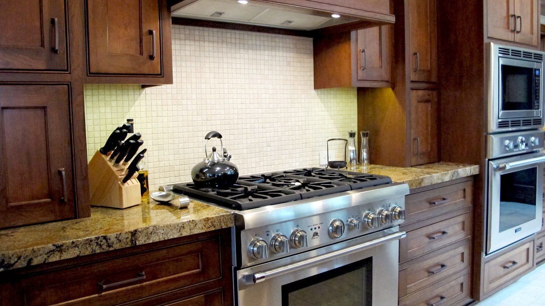 The kitchen was completely redone with new custom cherry cabinets, thick granite countertops and stainless steel appliances. The backsplash finishes these upgrades off with soft tumbled light travertine in a 1×1 mosaic sprawling full height leaving a lasting, timeless impression.