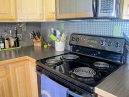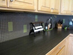 The kitchen features a grey linear laminate countertop that leads into a 1×1 glass mosaic backsplash. The backsplash features random glass rectangles that add a punch of color and bring interest to the space. These come in a wide variety of colors so you can add a lasting impression of your own.