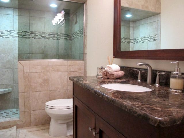 Who says basement bathrooms have to be dark and dingy? This beautiful guest bathroom puts that theory to shame. We used a porcelain tile by American Olean, called Pozzalo in the color Manor Gray. With coordinating sizes on the floor and ceiling, this bathroom is not only functional but has many upgraded features to give it a pleasing aesthetic value. An Emprador Dark polished slab was placed on a stunning freestanding vanity cut to fit an under mount sink for easy clean-up. The shower floor boasts a 2×2 Salcedo mosaic in a Universal Blend to capture and blend all the colors seamlessly.