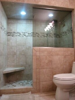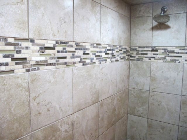 The border seen as a band around the shower, Stone Radiance by DalTile in a blend called Morning Sun/Tortoise/Mushroom, really ties the whole room together and gives this bathroom a focal point.